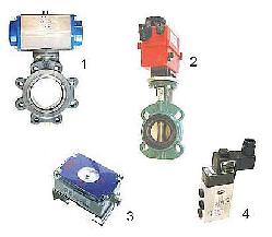 Absperrklappen mit aufgebauten pneumatischen (1) oder elektrischen (2) Antrieben. Optional zusätzlicher Aufbau von Endschaltern (3) und/oder Magnetventilen (4)